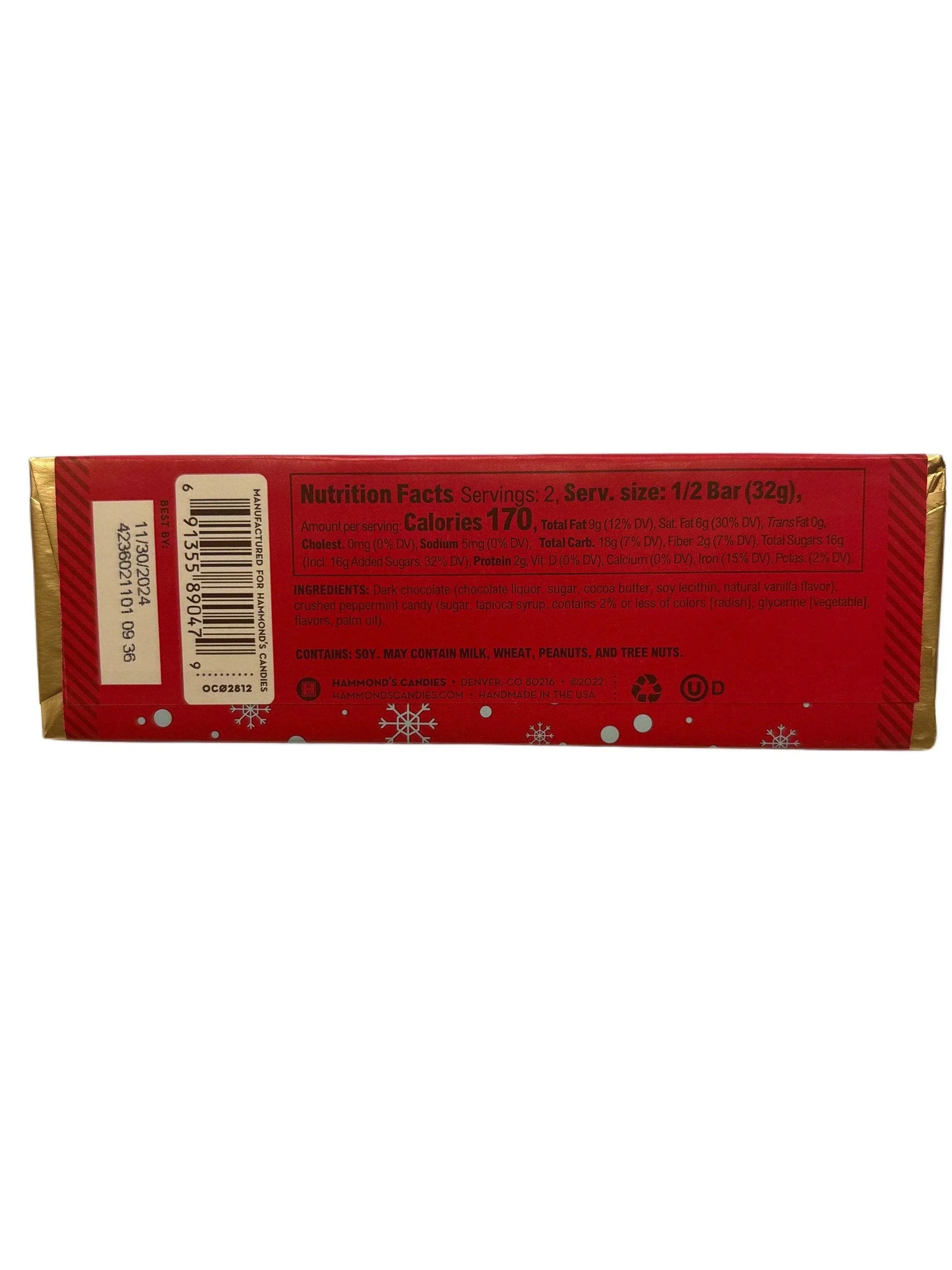 Indulge in the wintery magic of Hammond's Candy Cane Crunch Dark Chocolate Peppermint Frost. This 2.25oz treat features a creamy dark chocolate coating with bits of crunchy candy cane and a refreshing peppermint flavor. Perfect for a cozy night in or a fun stocking stuffer. (Satisfy your sweet tooth with a twist!)
