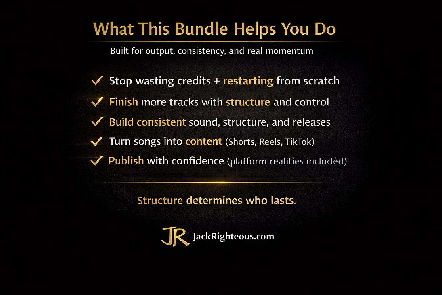 This bundle gives you a repeatable operating system to create, finish, and publish AI music with confidence — then turn it into content that builds momentum.