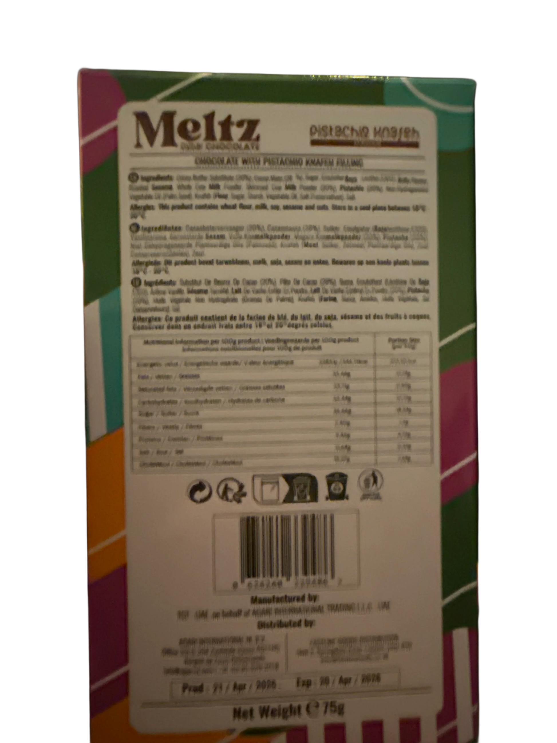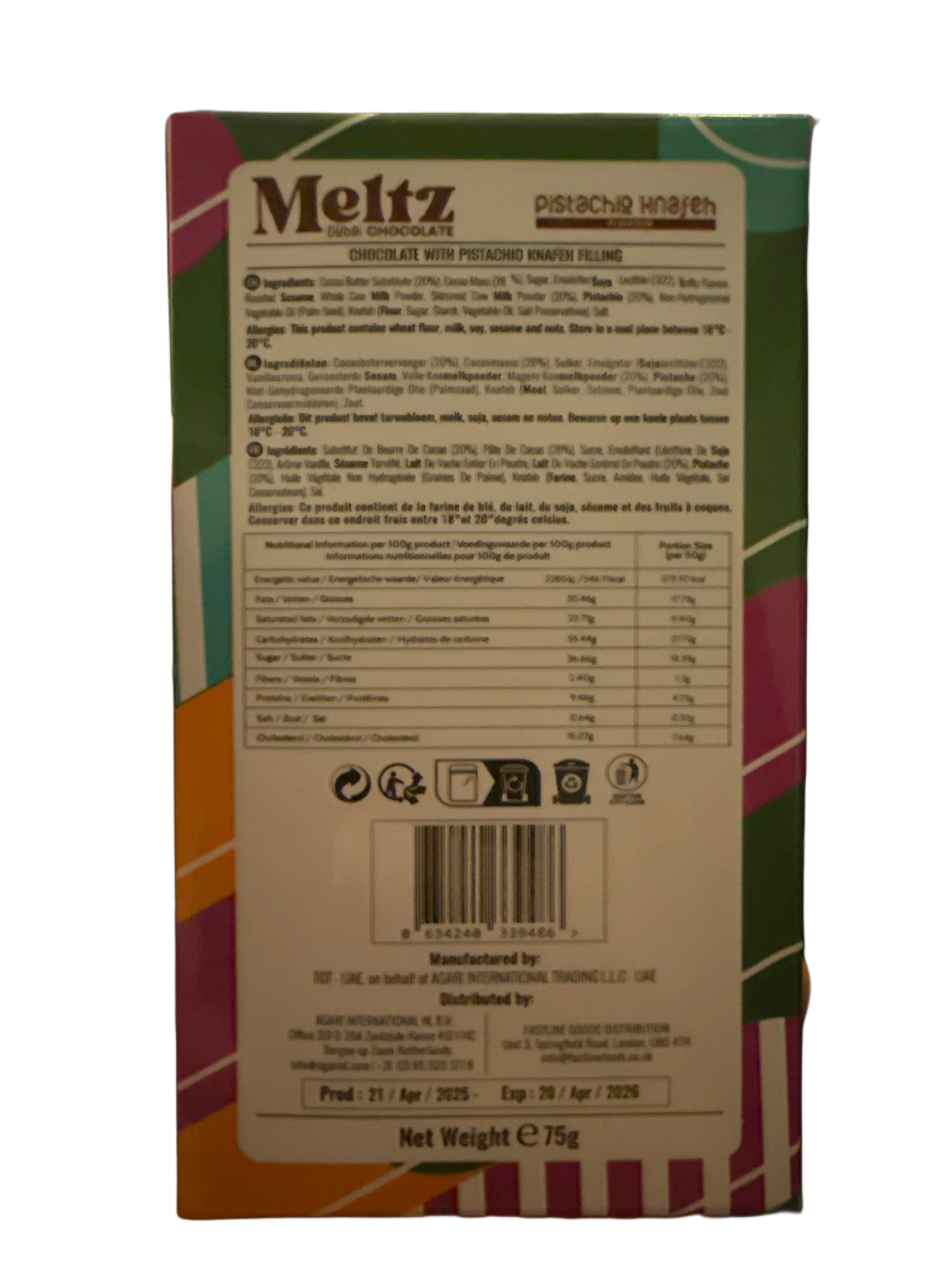 Experience the unique fusion of traditional Middle Eastern dessert and rich chocolate with Meltz Dubai Chocolate Pistachio Knafeh Flavour. This 75g Dubai Edition delicacy combines the nutty crunch of pistachios with the smooth, indulgent taste of chocolate, inspired by the iconic knafeh pastry. Perfect for those seeking an authentic yet innovative treat, it offers a sophisticated flavor profile that highlights cultural heritage with a modern twist. Ideal for gourmet snacking or gifting, this product delivers a refined taste experience in every bite.